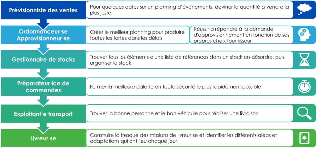 Pour répondre à ces objectifs, l’équipe Bretagne Supply Chain a imaginé et co-construit, avec des professionnel·le·s engagés de notre réseau, 3 parcours Métiers, composé de 18 animations. Chaque parcours met en musique 6 animations ludiques afin de faire découvrir concrètement les métiers de la chaîne d’approvisionnement.